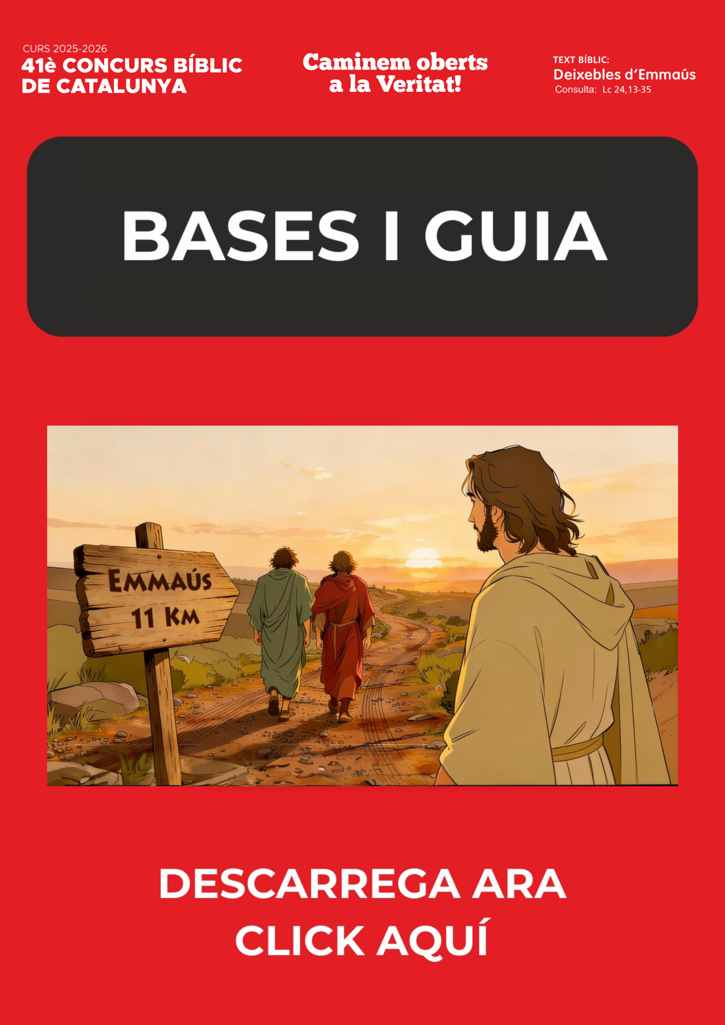 Sota el títol «Caminem oberts a la Veritat» , convidem a la lectura i l’aprofundiment del passatge de l’Evangeli de Lluc que narra l’aparició de Jesús als dos deixebles que caminaven cap a Emmaús (Lc 24,13-35). Aquesta trobada ens permetrà treballar valors fonamentals com l’amistat, el fet de caminar junts, l’acolliment, la descoberta d’un Déu proper i la joia de qui reconeix Jesús en la seva vida.